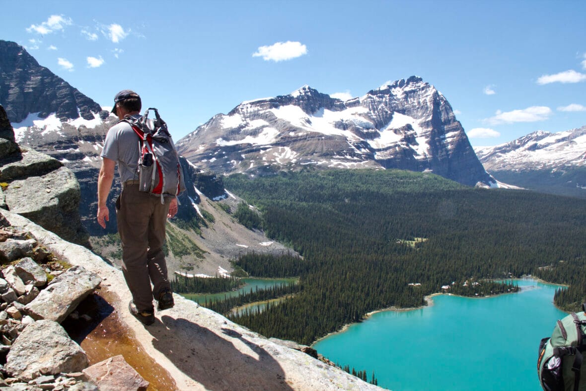 A hiker crosses along a precipitous ledge overlooking British Columbia’s Lake O’Hara in Yoho National Park. The area was named after Lieutenant-Colonel Robert O’Hara, who explored it in 1887 following a recommendation from a surveyor. (Gerry Feehan photo for Vacay.ca)